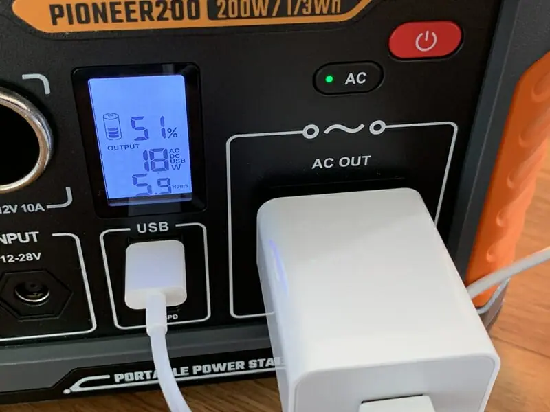 AC(コンセント)出力の場合もUSB出力の場合と同様に、ACポートにコンセントを接続し、デバイスに挿すだけだ。
