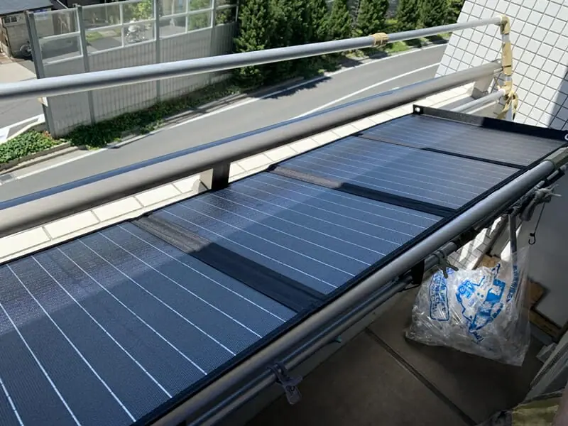 ▼快晴の夏日、自宅ベランダにソーラーパネルを設置。