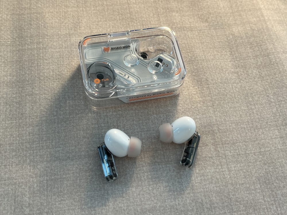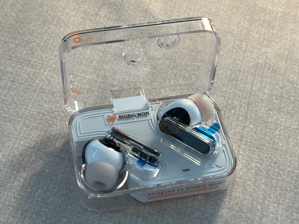 イヤホン本体およびチャージケースは、中の基盤が見えるスケルトンデザインを採用。刺さる人には刺さる見た目となっている。パッケージには3種類のイヤーチップが付属しており、耳穴の大きさに応じて柔軟に調節できる。