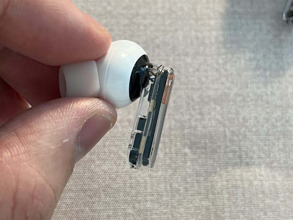▼本製品(画像左)とAirPods Pro(画像右)。AirPods Proよりもやや小さいサイズ感。