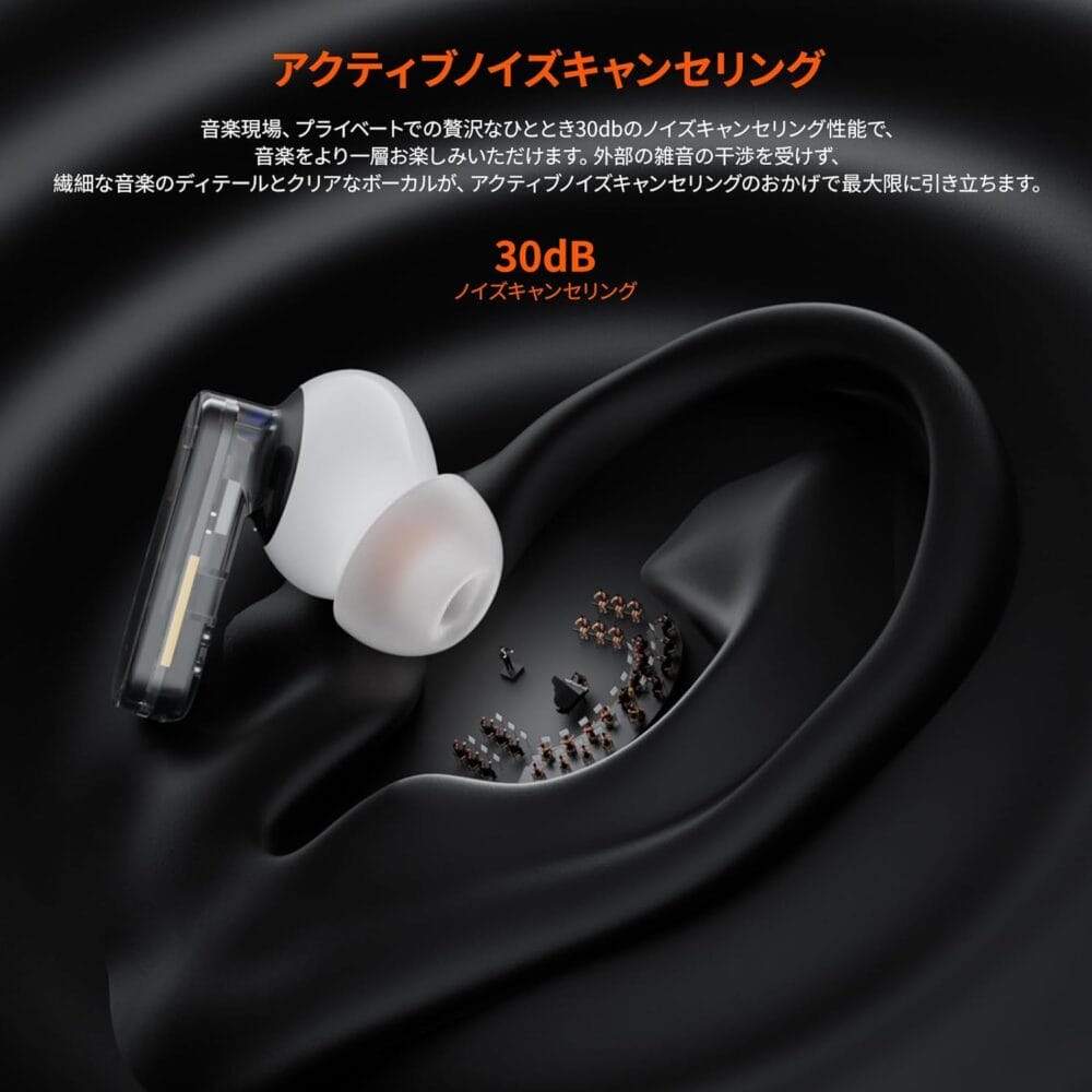 30dBのアクティブノイズキャンセリング機能も備えており、外部の騒音や環境音をシャットアウトして、イヤホンからの音楽のみに集中することが可能だ。