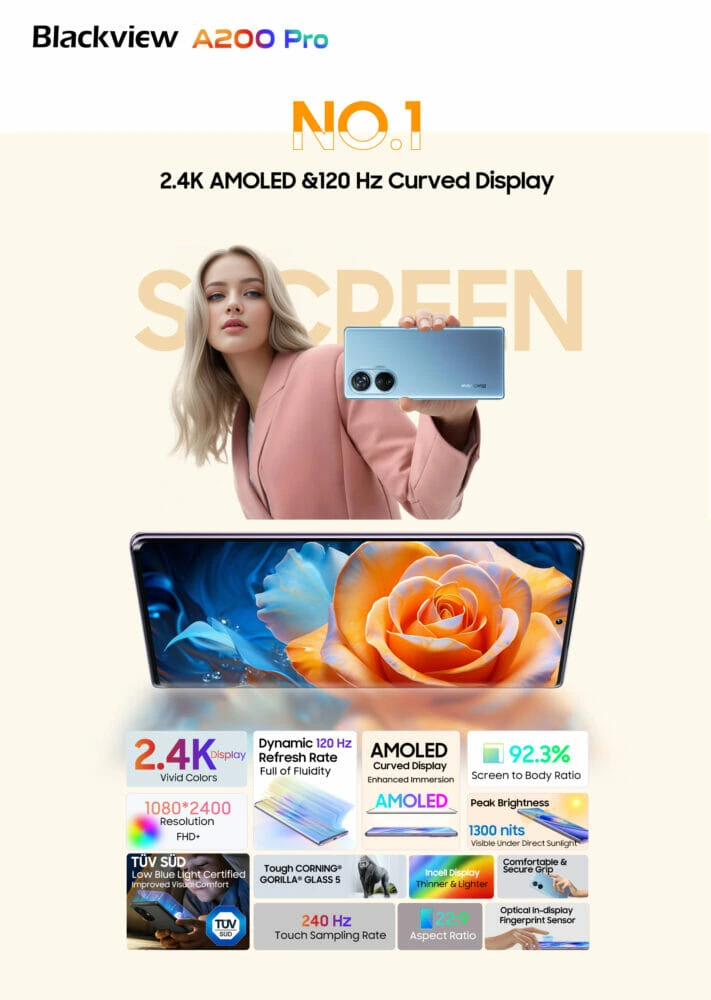 『Blackview A200 Pro』は6.67インチ AMOLED、120Hzリフレッシュレート対応のディスプレイには曲面スクリーンを採用。人間工学に基づいた曲率でデザインされ、ユーザーにとって最も快適な手持ち感を実現している。なお、ディスプレイ内には指紋認証センサーを内蔵。240Hzのタッチサンプリングレートにより、ゲームアプリなどでも正確な操作が可能だ。