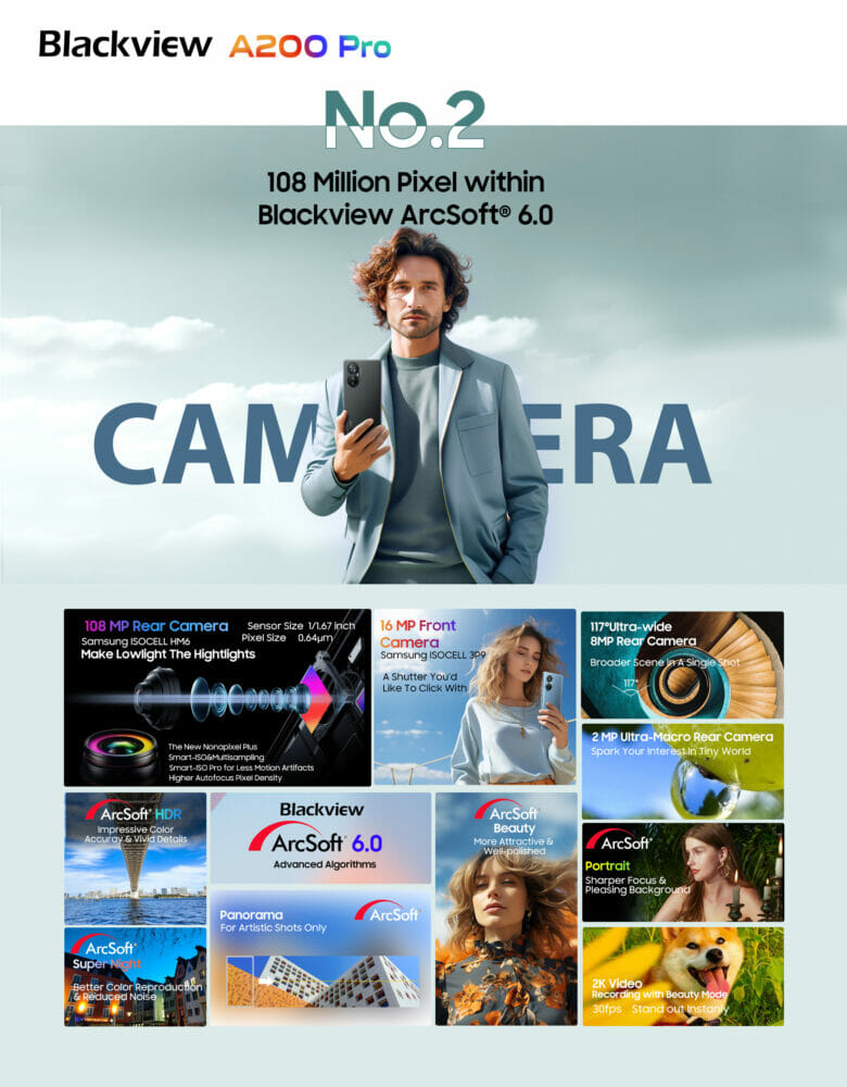 背面には108MP(メイン)+8MP(超広角)+2MP(マクロ)リアカメラを搭載。さまざまな場面における撮影ニーズに対応するため、A200 Proは複数のカメラモード(HDR、スーパーナイト、ポートレート、ビューティ、パノラマ、およびビューティモード付きの2K・30fpsビデオ録画)に対応しており、すべてがBlackviewの独自技術「ArcSoft® 6.0アルゴリズム」によってサポートされている。これにより、撮影写真の品質は従来モデルと比較して最大15%向上している。