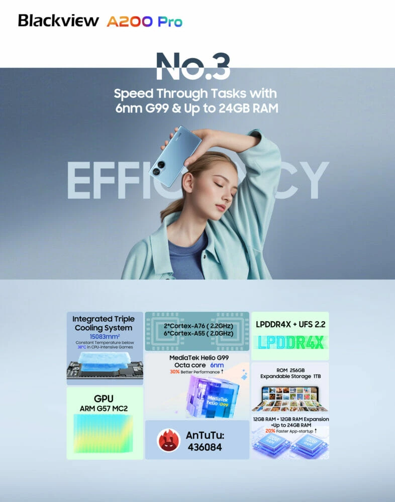 『Blackview A200 Pro』はCPU(SoC)にMediaTek Helio G99 オクタコアプロセッサーを採用。RAMには12GB LPDDR4Xを搭載しており、最大12GBの仮想RAM拡張も可能となっている。