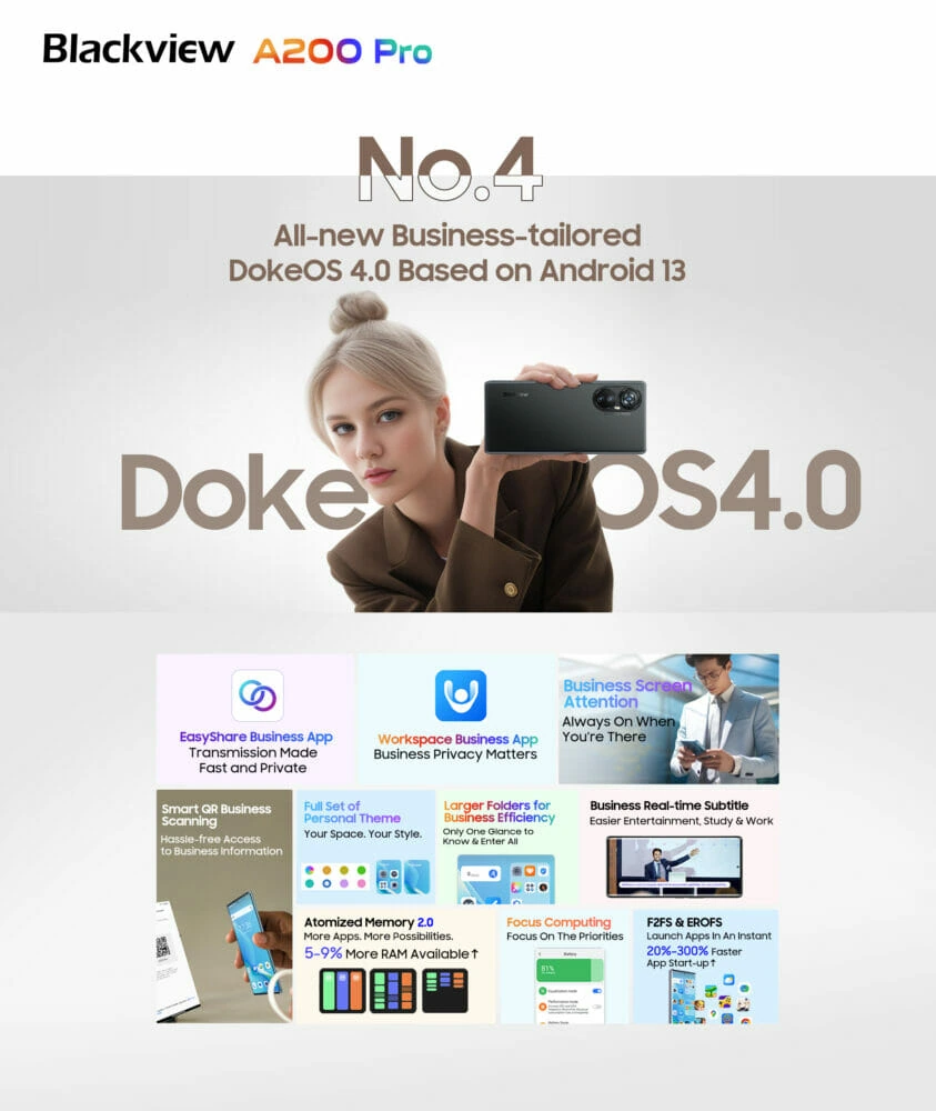 『Blackview A200 Pro』にはBlackviewが新たにリリースするAndroid 13ベースの独自OS「DokeOS 4.0」が搭載されている。よりビジネスに適したシステムになっており、直感的でユーザーフレンドリーなインターフェース、ビジネスにおけるプライバシーを高めるための洗練された個人許可設定、その他、スムーズなスマホ利用を実現するための革新的な技術を多く取り入れている。