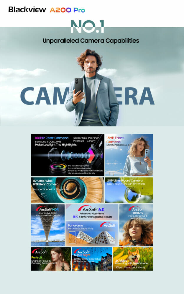 背面には108MP(メイン)+8MP(超広角)+2MP(マクロ)リアカメラを搭載。さまざまな場面における撮影ニーズに対応するため、A200 Proは複数のカメラモード(HDR、スーパーナイト、ポートレート、ビューティ、パノラマ、およびビューティモード付きの2K 30fpsビデオ録画)に対応しており、すべてがBlackviewの独自技術「ArcSoft® 6.0アルゴリズム」によってサポートされている。これにより、撮影写真の品質は従来モデルと比較して最大15%向上しているとのこと。