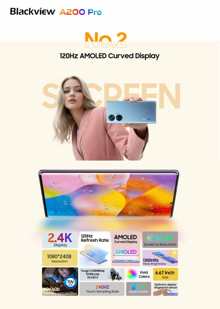 2,400×1,080(FHD+)解像度の6.67インチAMOLED曲面ディスプレイを搭載。Blackview独自のArcSoft® 6.0アルゴリズムを取り入れた108MP(メイン)+8MP(超広角)+2MP(マクロ)リアカメラを内蔵。そして66W急速充電対応の5,050mAh大容量バッテリーを備えるなど、全体的にスペックの充実したフラグシップモデルとなっている。
