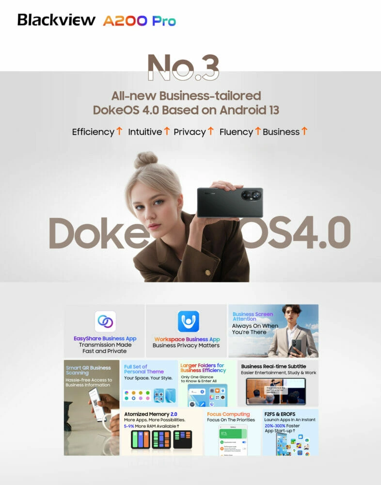 『Blackview A200 Pro』にはBlackviewが新たにリリースするAndroid 13ベースの独自OS「DokeOS 4.0」が搭載される予定。よりビジネスに適したシステムになっており、直感的でユーザーフレンドリーなインターフェース、ビジネスにおけるプライバシーを高めるための洗練された個人許可設定、その他、スムーズなスマホ利用を実現するための革新的な技術を多く取り入れている。