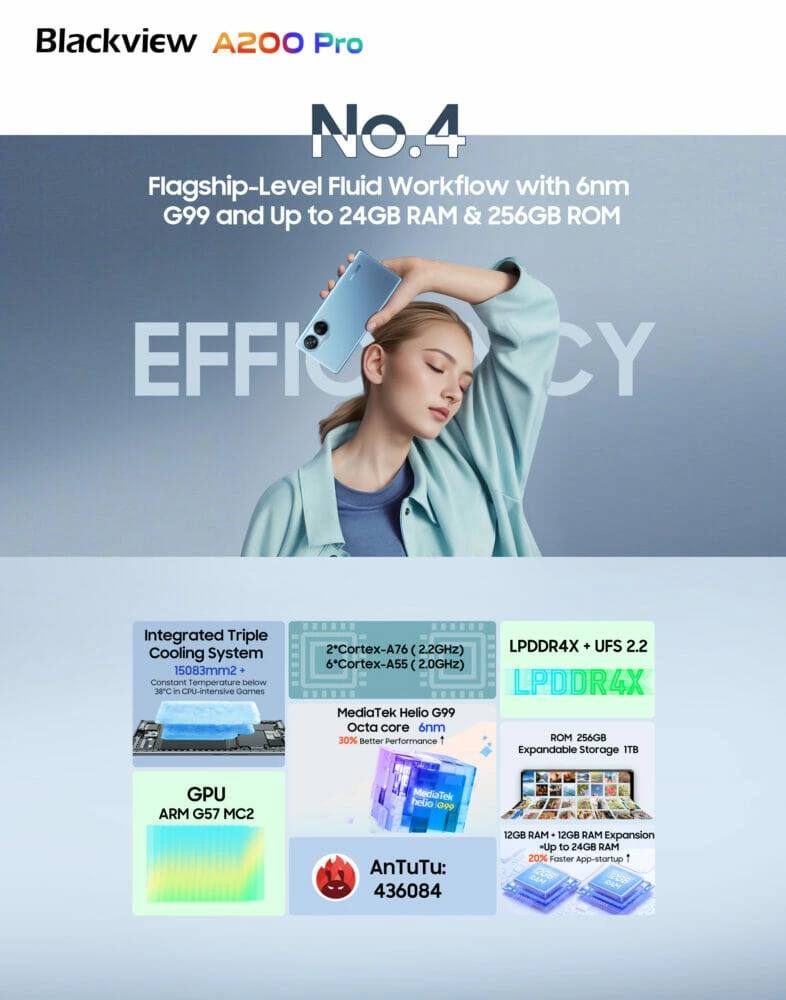『Blackview A200 Pro』はCPU(SoC)にMediaTek Helio G99 オクタコアプロセッサーを採用。RAMには12GB LPDDR4Xを搭載しており、最大12GBの仮想RAM拡張も可能となっている。