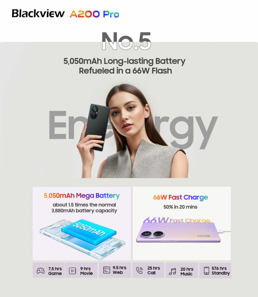 『Blackview A200 Pro』には5,050mAhの大容量バッテリーが内蔵。これは一般的なスマホの1.5倍の容量だ。66W急速充電に対応しているため、わずか20分の充電時間でバッテリー残量を0%→50%まで回復させることが出来る。