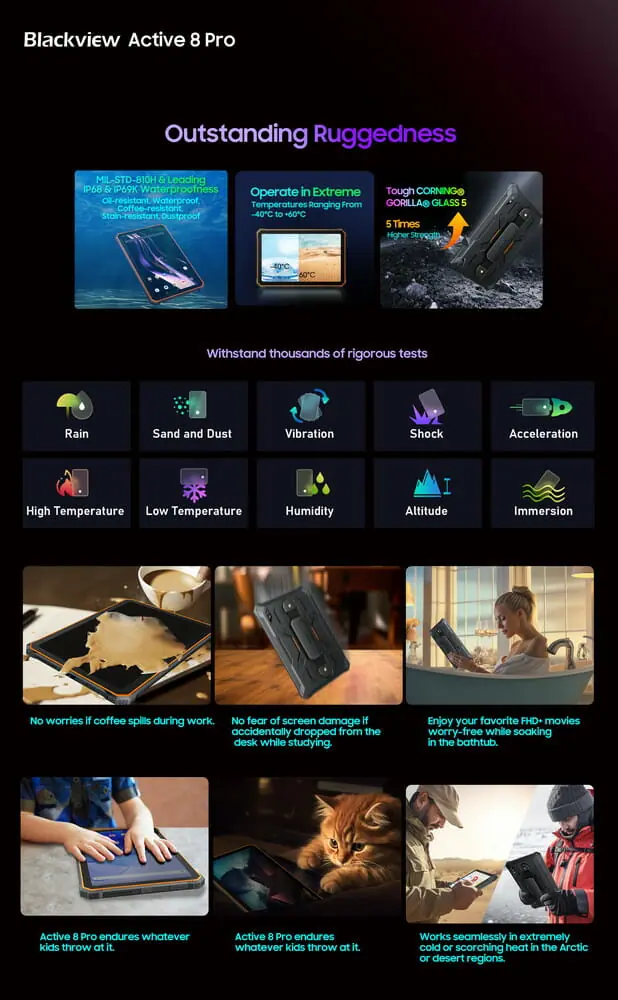 さらにActive 8 Proに固体電池(ソリッドステートバッテリー)を採用することで、安全性が大幅に向上し、極端な温度に対する耐性も向上している。Blackviewの実験テストデータによれば、Active 8 Proは氷点下や灼熱の暑さでも、-40℃から+60℃の広い温度範囲で正常に動作する。さらに、同じバッテリー容量のタブレットと比較して、Active 8 Proは約30%軽く、携行性を強化するためのパッド付きのレザーパッドが付属している。