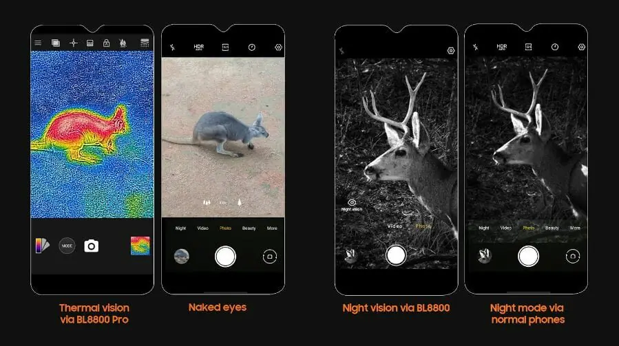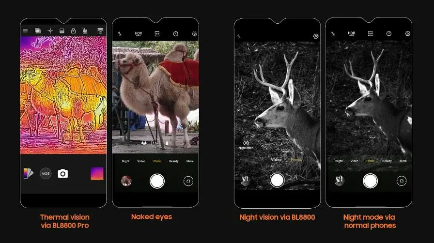BL8800 Proは、FLIR®Lepton®熱画像カメラと50MP超クリアカメラを備えている。 一方でBL8800は、暗視カメラ、50MP超クリアカメラ、117°超ワイドカメラを備えている。