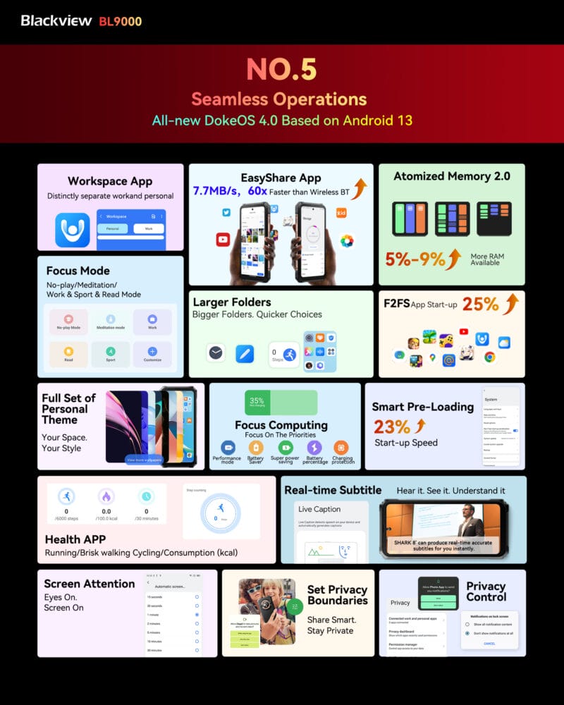 BL9000は、Android 13をベースにした新しいDokeOS 4.0を搭載し、ネットワークサポートなしで7.7MB/sの高速ファイル共有が可能なEasyShareアプリを備えている。仕事と個人の両方のスペースを整理できる「Workspace」アプリ、集中力を高めることのできる「Focus」モードなど、豊富な便利機能が用意されている。