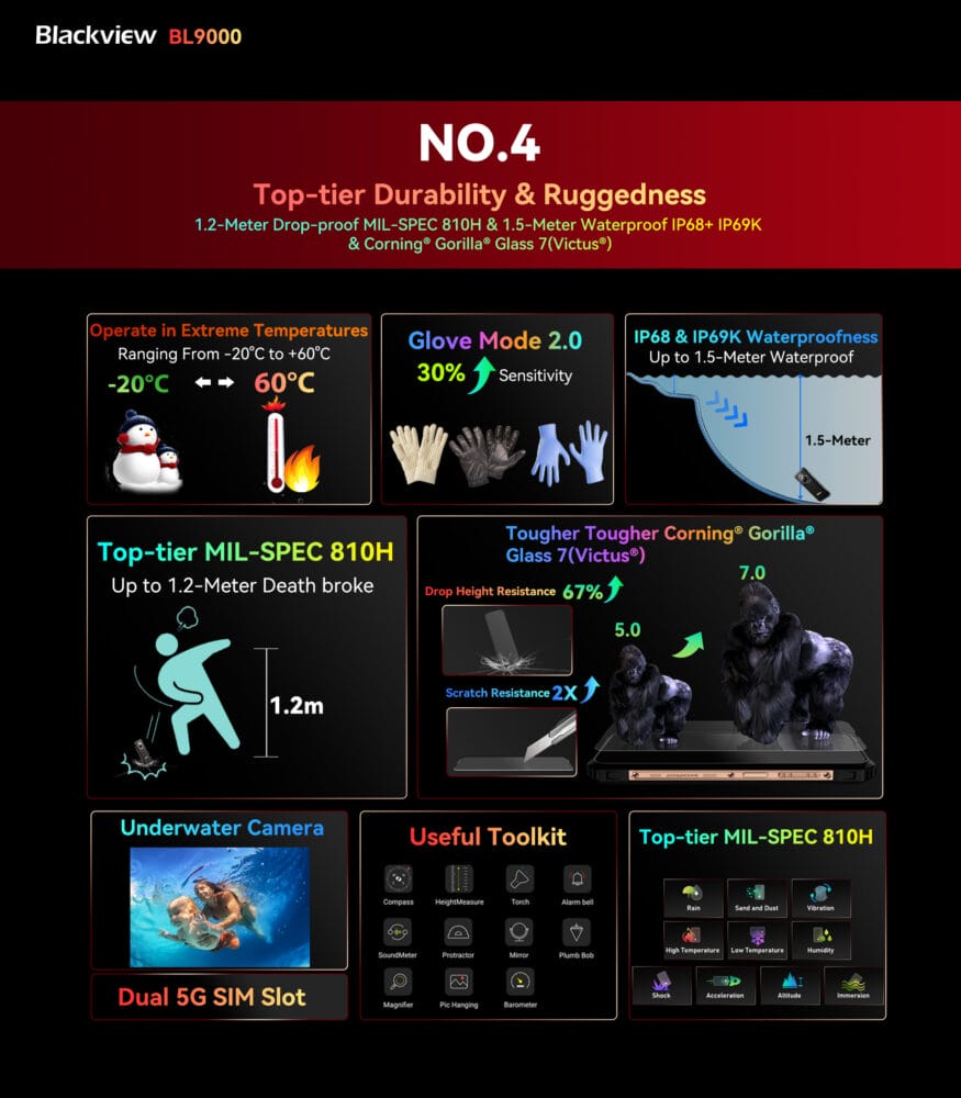 BL9000は最上位の耐衝撃軍事規格である「MIL-STD-810H」に対応しており、1.2メートルまでの落下耐性を備えている。IP68・IP69Kの防水等級にも対応しており、1.5メートルの水中でも正常に機能し、-20°Cから60°Cの温度範囲で安定して操作できる。