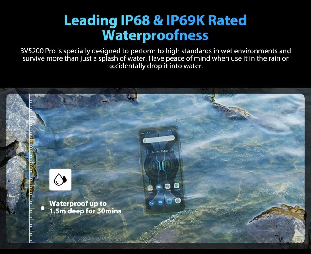 Blackview BV5200 Proは、IP68&IP69Kの防水規格、およびMIL-STD-810Hの耐衝撃規格に対応。日常の落下や衝突に耐えられるように、優れた頑丈な耐久性を備えて設計されている。