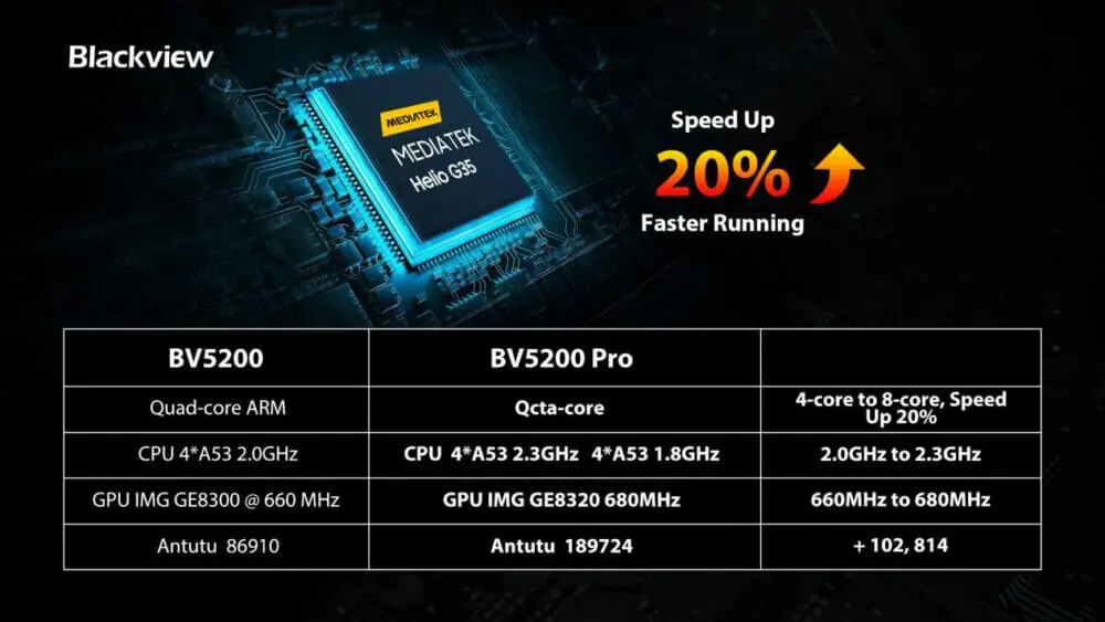 BV5200 のMediaTek Helio A22クアッドコアプロセッサーと比較して、Blackview BV5200 ProはMediaTek Helio G35 オクタコアプロセッサーを搭載。4 GBのRAM によって約20%の処理スピードアップを実現し、仕事から遊びまでパフォーマンスを向上させている。