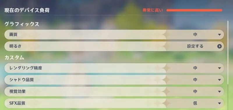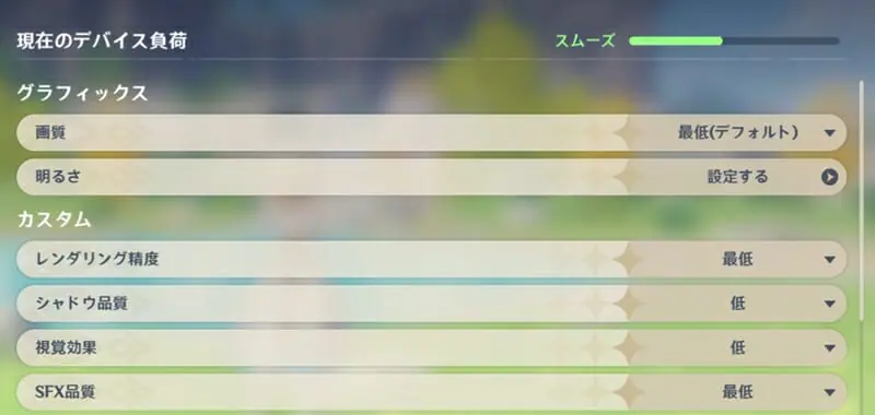 ▼画質設定はデフォルト状態で "最低" に設定されており、デバイス負荷は "スムーズ" の状態。