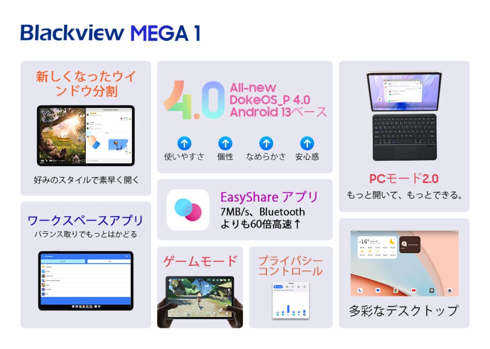 『Blackview MEGA 1』は、Android13をベースとした独自OS「DokeOS_P4.0」を採用している。仕事から遊びまで便利なアプリを多数実装しているほか、分割画面表示、ピン留め機能などの便利機能も搭載。