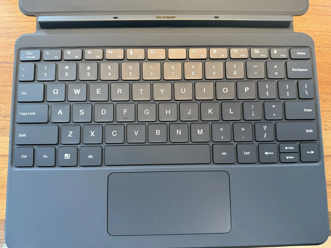 キーボードはUS配列。一つ一つのキーは大きめで、タッチパッドも備わっているため、ノートPCのような操作感覚でタブレットを使用できます。