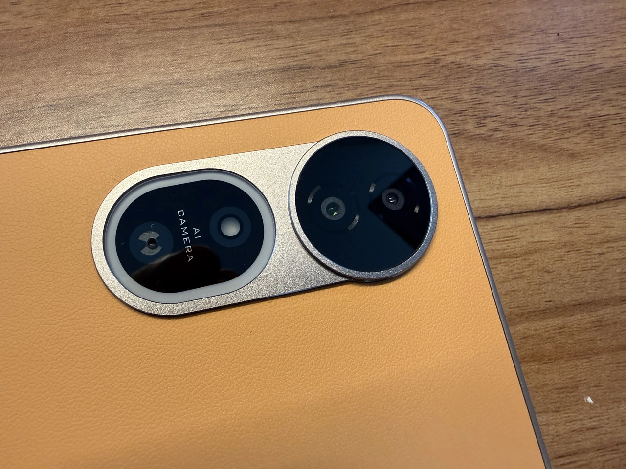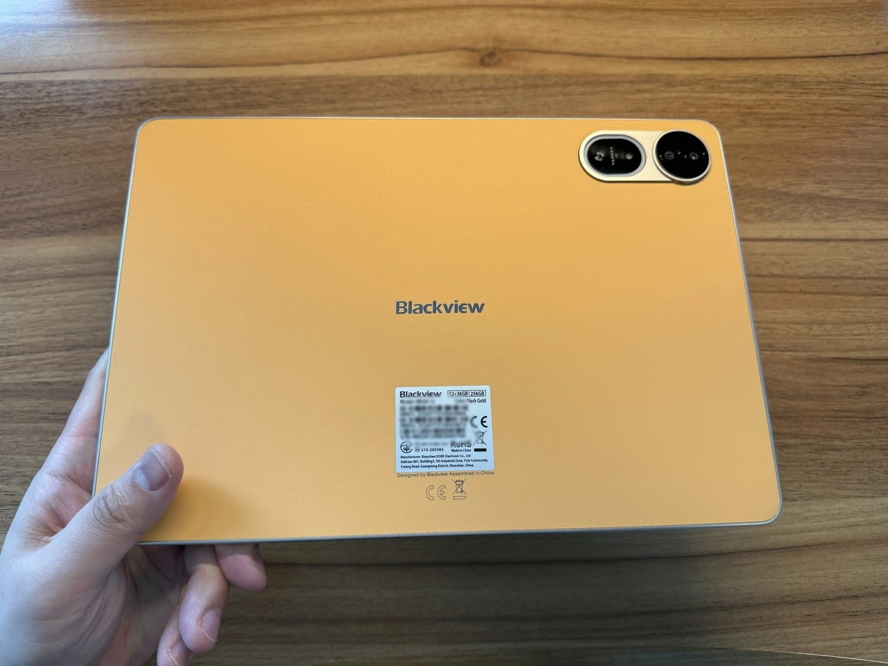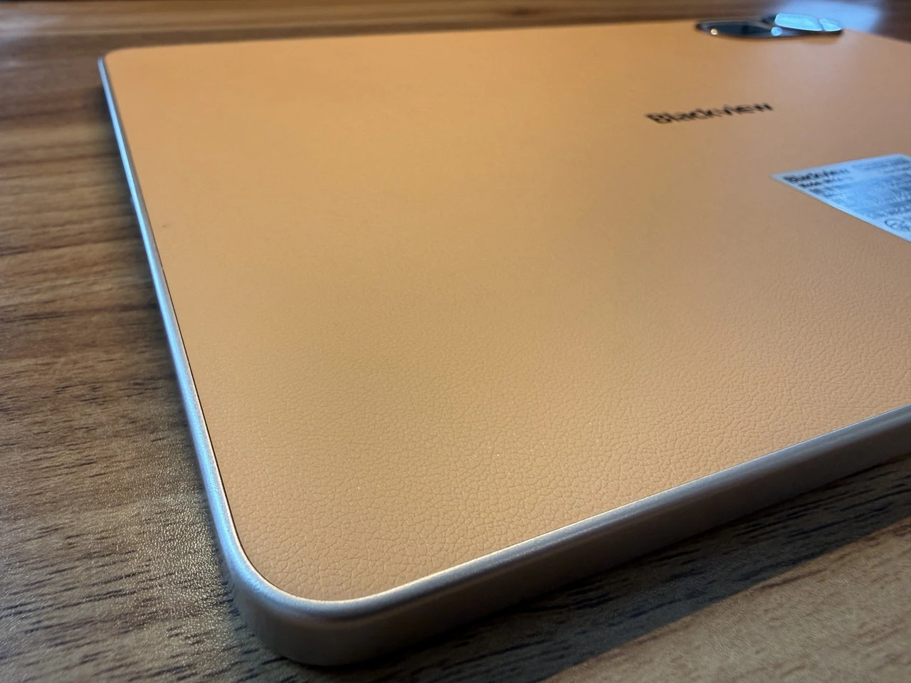本体に触れた率直な感想としては、「これまでのBlackviewタブレットの中で、もっとも完成度が高いかも」という印象です。力を入れても軋み音はほとんどなく、レザー調の表面仕上げが施された背面は、デザイン性と手触りを両立しています。