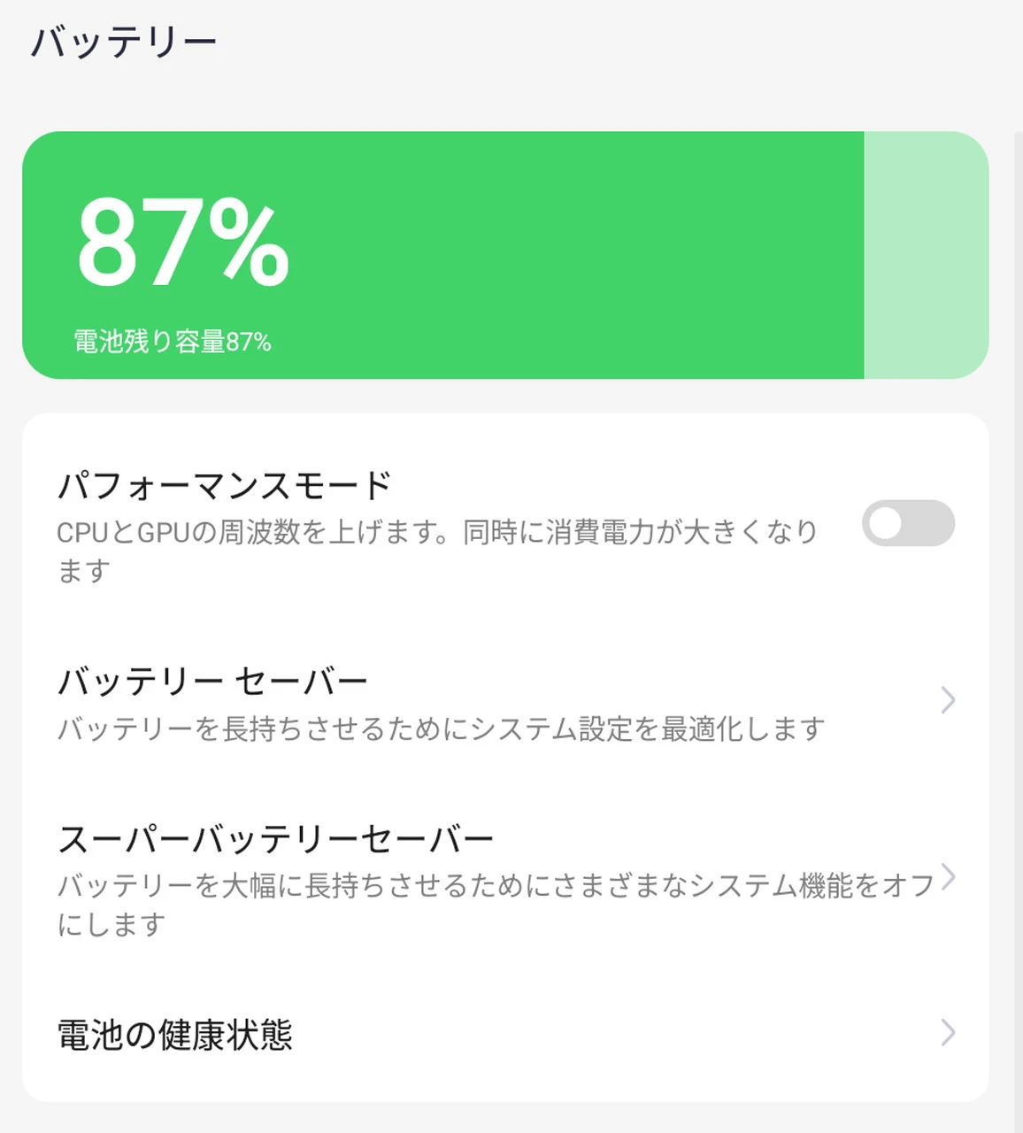 実際に満充電の状態から3時間ほど処理の重いゲームアプリを連続して遊んでみたところ、30%ほどしかバッテリーが減っておらず、1日以上持続可能な充電残量を残していました。バッテリーセーバーを起動すれば、より長時間使用できるようにもなります。