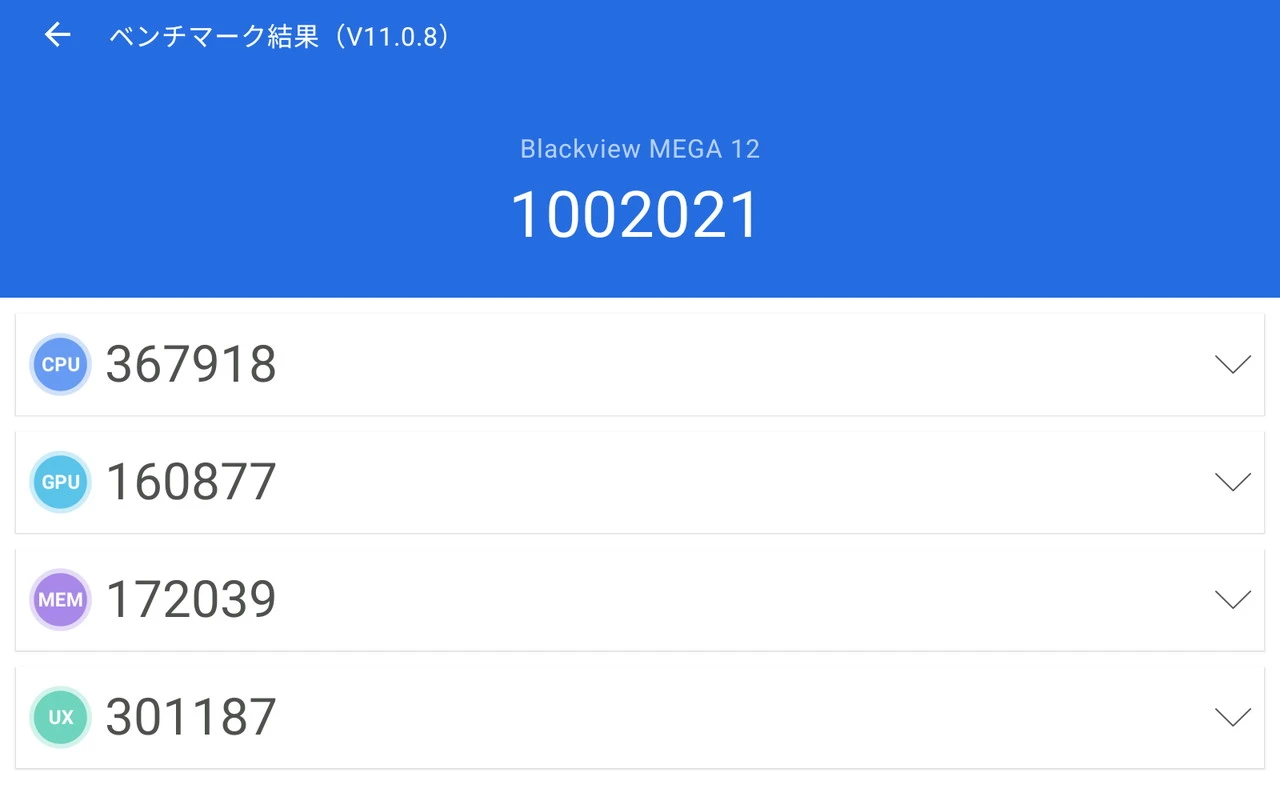 『Blackview MEGA 12』のAnTuTuベンチマークテスト結果