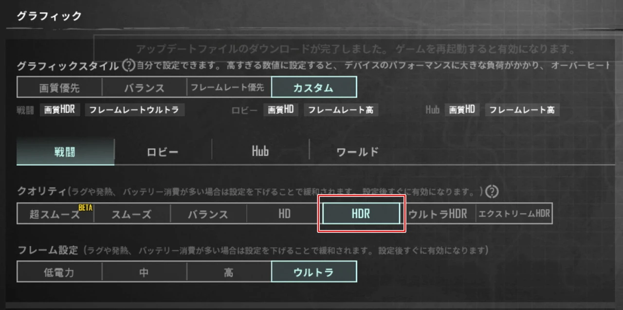 『PUBG』について、グラフィッククオリティは『HDR』まで選択できました。