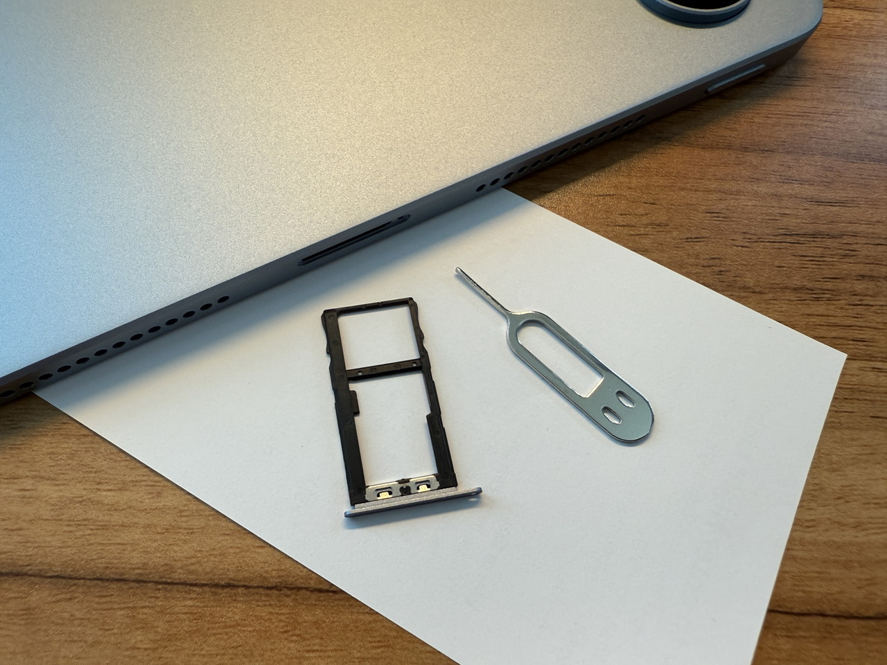 ▼付属のピンでスロットを開き、デュアルnanoSIMカードおよび最大2TBのマイクロSDカードを挿入可能。