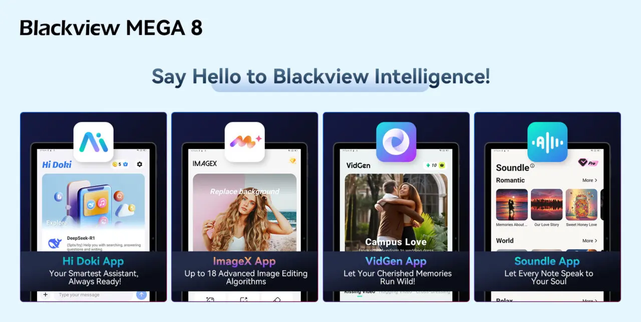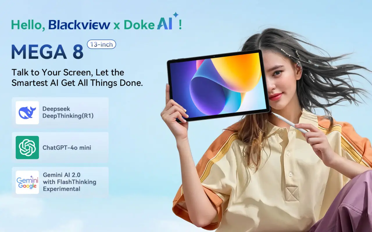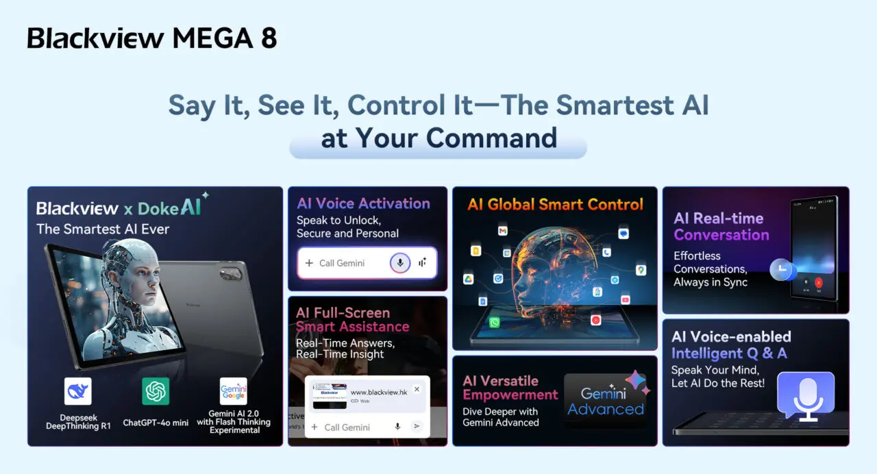 『Blackview MEGA 8』にはDeepSeek R1、ChatGPT-4o mini、Gemini AI 2.0という3つの最先端AIが搭載されており、音声入力による操作、スマートアシスタント機能の利用、リアルタイムの対話など、手を使わずにアプリや機能を自由に操作することができます。