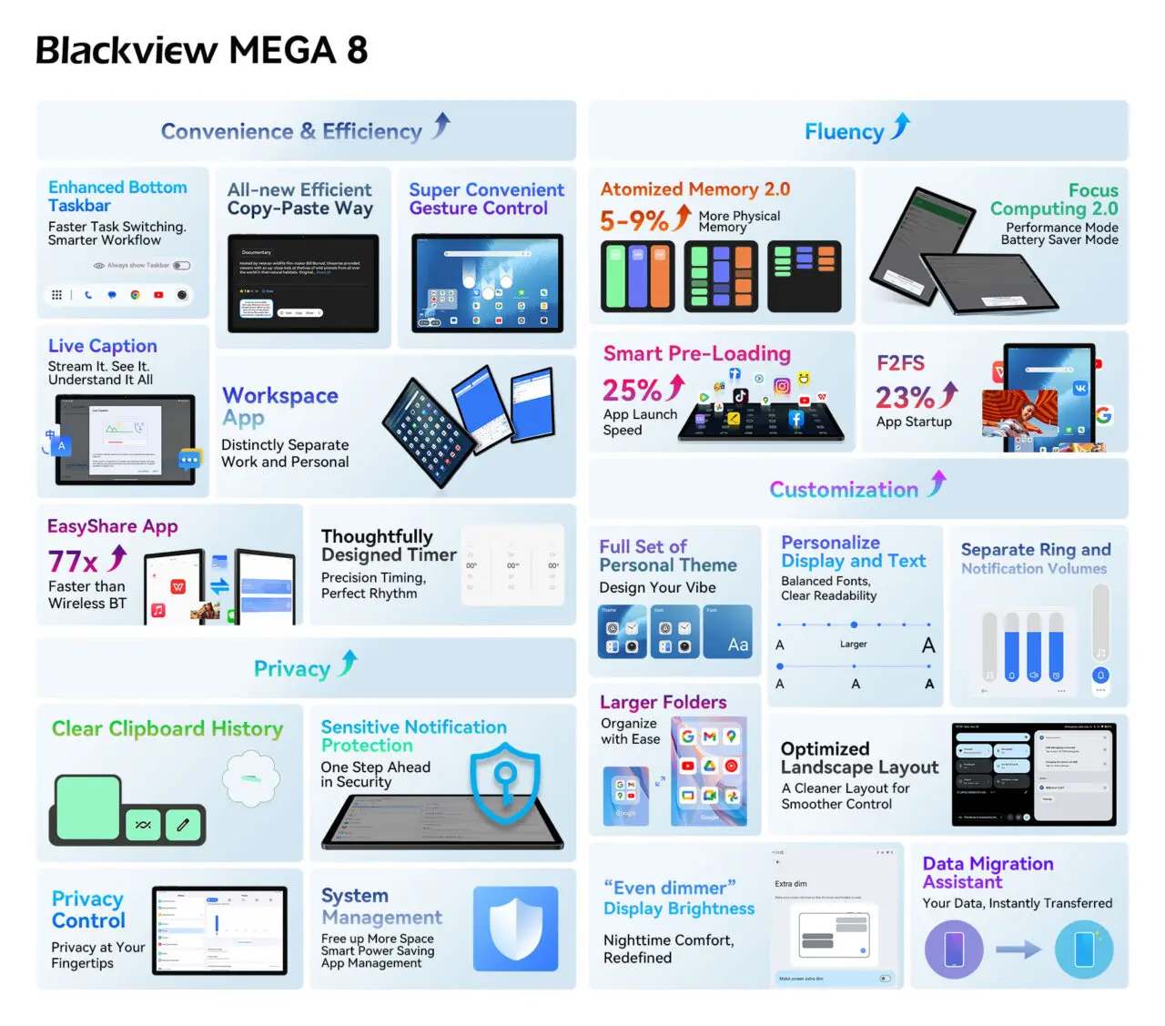 『Blackview MEGA 8』は、Android 15ベースのDokeOS_P 4.1を搭載しており、タブレット利用をより快適にするアプリや機能を豊富に用意しています。