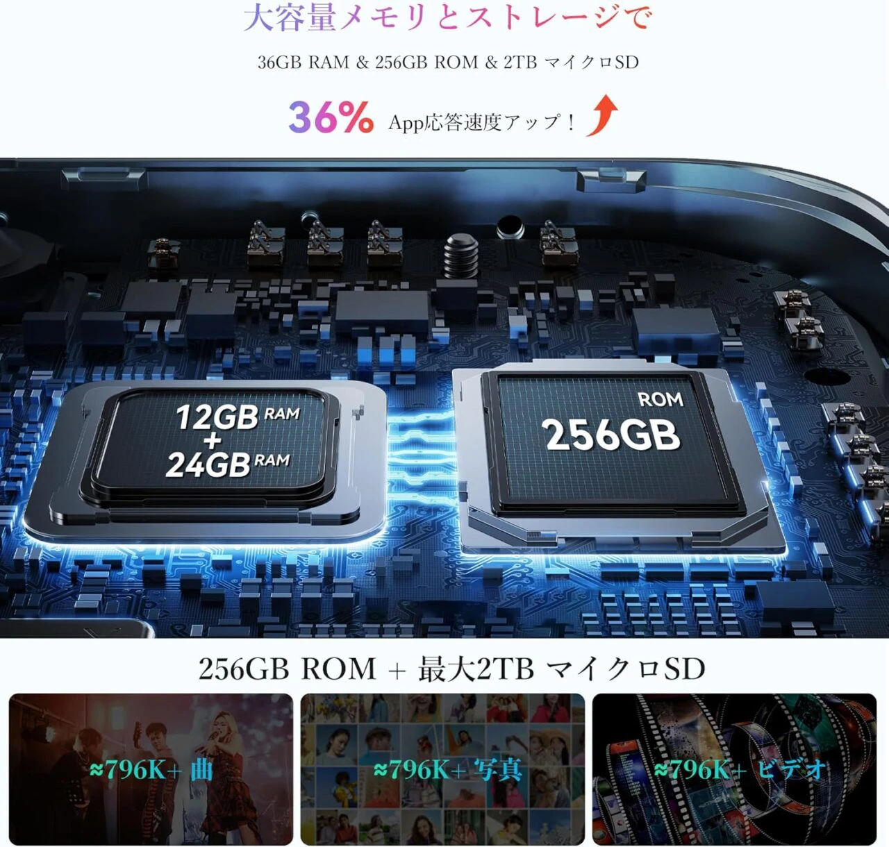 CPU(SoC)には「Unisoc T615 オクタコアプロセッサー」を、RAM(メモリ)には8GB /12GB LPDDR4Xを採用。一般的なスマホ用途は問題なくスムーズにこなせるだけの性能を擁している。なお、最大16GB/24GBの仮想RAM拡張が可能だ。