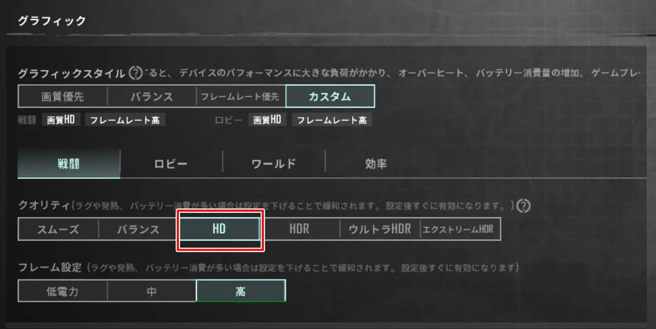 まずグラフィッククオリティに関しては『HD』まで選択できた。