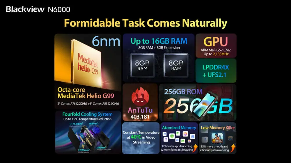 Blackview N6000は頑丈なだけでなく、スペック面でも優れている。CPUには「MediaTek Helio G99 オクタコアプロセッサー」を採用し、Arm Mali G57級の高性能GPUも備えている。ウェブブラウジングのような日常のタスクから、ゲームのようなリソースを多く必要とするタスクまで、満足度の高いパフォーマンスを発揮する。