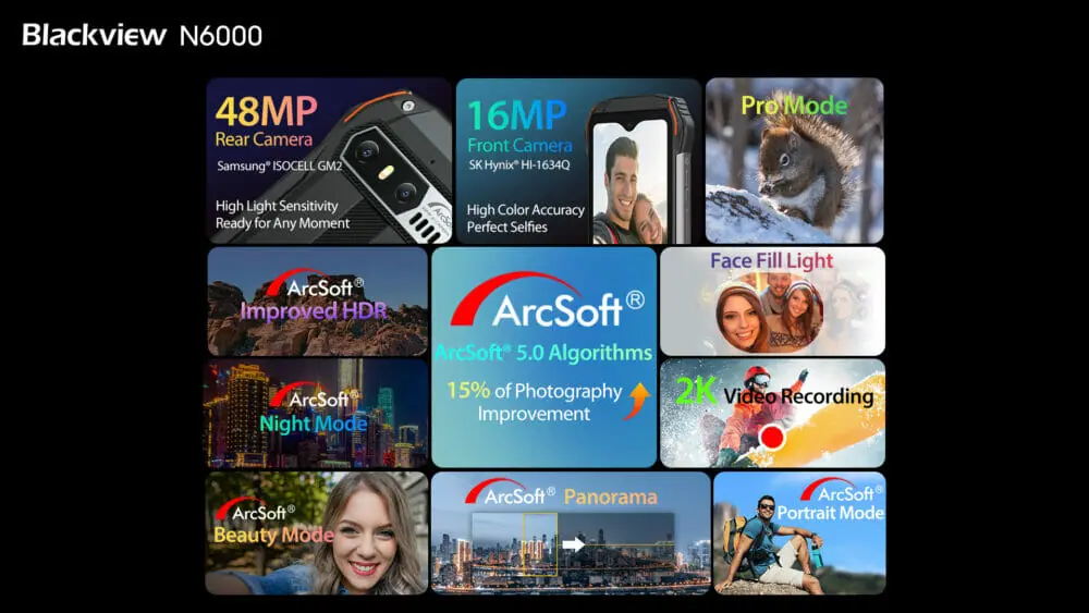 Blackview N6000は16MPのフロントカメラと、48MPのSamsung® ISOCELL GM2カメラを備えている。これらのカメラは、写真品質を向上させるための「ArcSoft® 5.0」技術が搭載されており、深夜から日中まで、ノイズが少なく鮮明な写真を撮影できる。