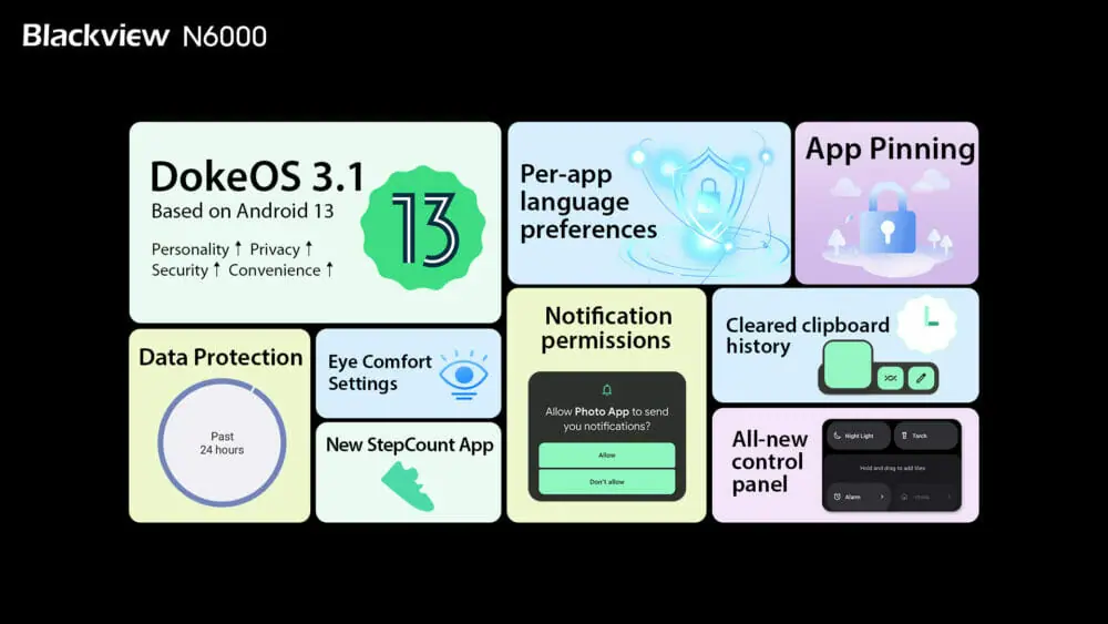 Blackview N6000は最新の「DokeOS 3.1」(Android 13ベース)を搭載している。Android12と比べて、通知権限やクリップボード履歴の消去などの新機能が追加され、ユーザーのプライバシー保護が充実している。