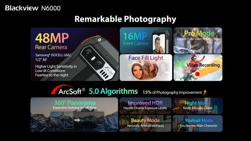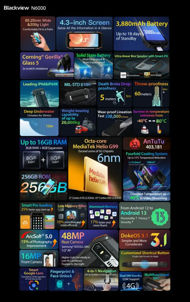 MediaTek Helio G99オクタコアプロセッサー搭載、最大16GBまで拡張可能なRAMと256GBの内部ストレージを採用。Android 13ベースのDokeOS 3.1を採用。そしてBlackviewの独自テクノロジー「ArcSoft® 5.0アルゴリズム」を搭載した16MP+48MPのカメラが内蔵されるなど、小型ボディに優れたスペックを詰め込んだタフネスモデルとなっている。
