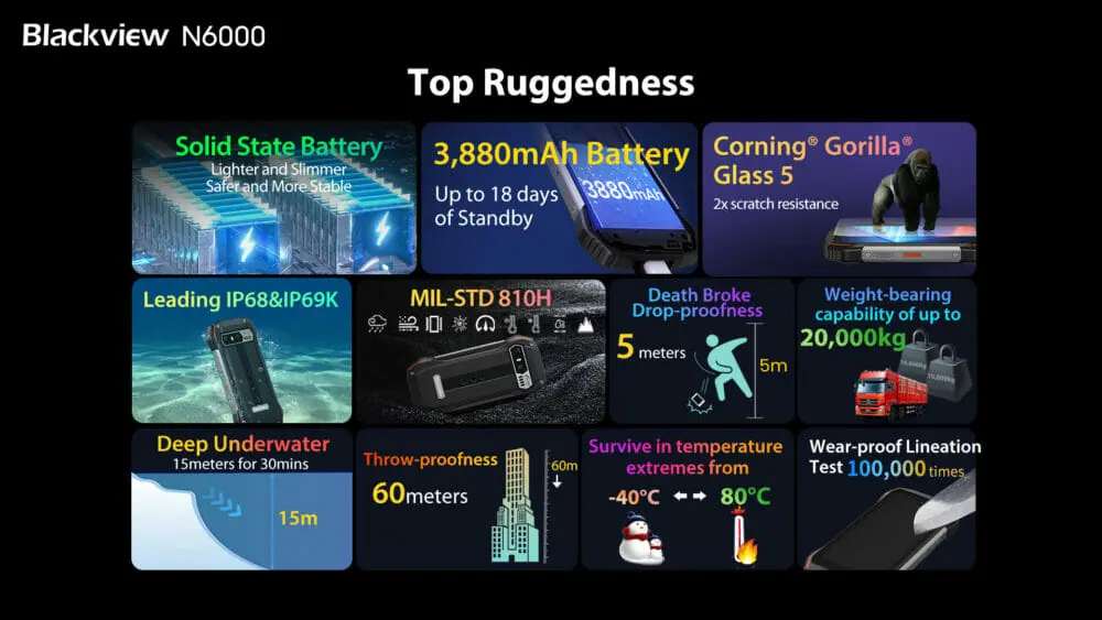 厳しい環境に立ち向かうために作られたN6000は、クラシックなBlackviewのデザインと、固体電池(ソリッドステートバッテリー)などの選ばれた材料を採用することで、より高い耐久性を実現している。