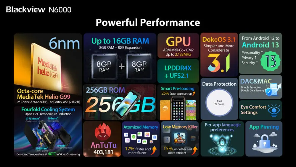 N6000は、MediaTek Helio G99オクタコアプロセッサーと最大16GBまでの拡張に対応したRAMを搭載しており、Antutuベンチマークで403,181のスコアを達成している。また、多くのデータを保存するために256GBの内部ストレージが用意。