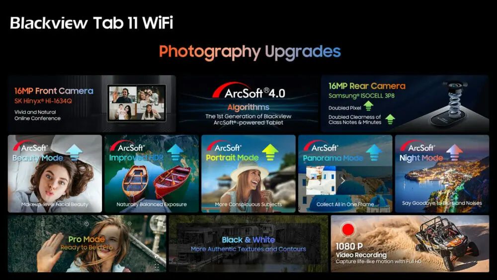 Blackviewタブレットに初めて導入された革新的な「ArcSoft® 4.0」アルゴリズムは、ビューティモード、HDR、ポートレートモード、パノラマモード、ナイトモードなどのカメラモードの写真性能を次のレベルに引き上げる。さらに多くのモード、例えばプロモード、白黒モード、1080Pビデオ録画などを含むTab 11 WiFiは、ユーザーがより多くのシーンを撮影し、より多くの写真ジャンルを試すことを可能にし、安定した高精細な画像を撮影できるようにしている。