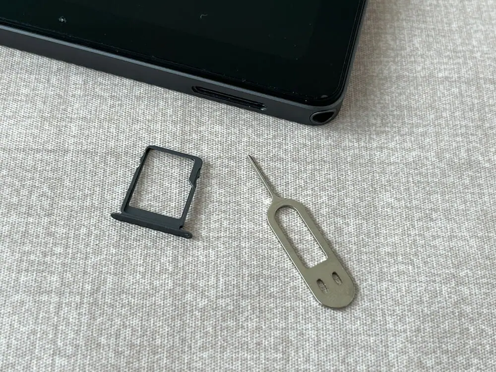 ▼付属のピンを用いてスロットを開き、最大1TBまでのマイクロSDカードを挿入することが出来る。