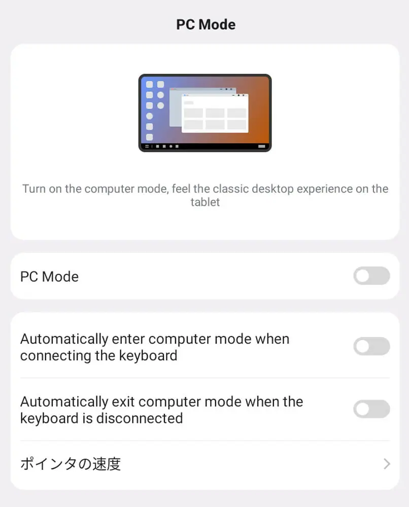 本製品はPCモードに対応しており、Windowsのようなインターフェース配置でタブレットを利用できる。