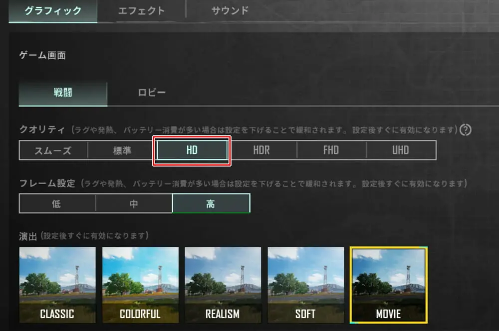 まずグラフィッククオリティに関しては『HD』まで選択できた。