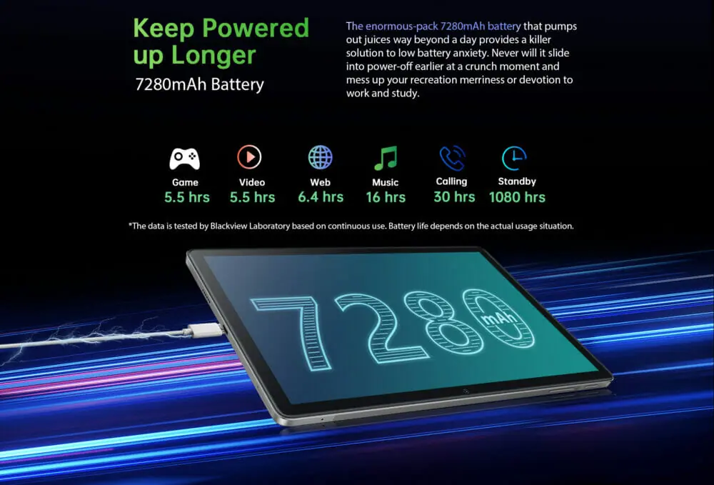 Blackview Tab 13は、すべてのタブレットシリーズの中で最大の7,280mAh大容量バッテリーを搭載しており、普通に利用するユーザーの場合、1 回の充電で最大30 時間の連続使用が可能だ。