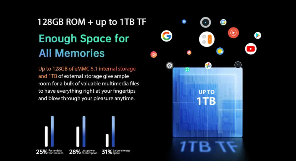 Blackview Tab 13はデフォルトで6GB RAMおよび128GBストレージを搭載しており、必要に応じてRAMは最大10GBまで、ストレージは最大1TBまで拡張することが可能となっている。