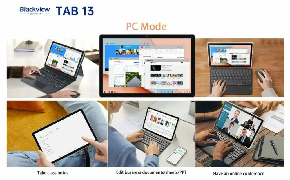 Blackview Tab 13 はPC モードを搭載しており、PCのようなユーザーインターフェースで作業を行うことも出来る。またマルチウィンドウにも対応しており、ユーザーは画面タッチ機能の利便性と、複数のアプリ ウィンドウを同時に開くことができるPCの両方の利点を活用することが可能であり、作業の生産性が大幅に向上するだろう。