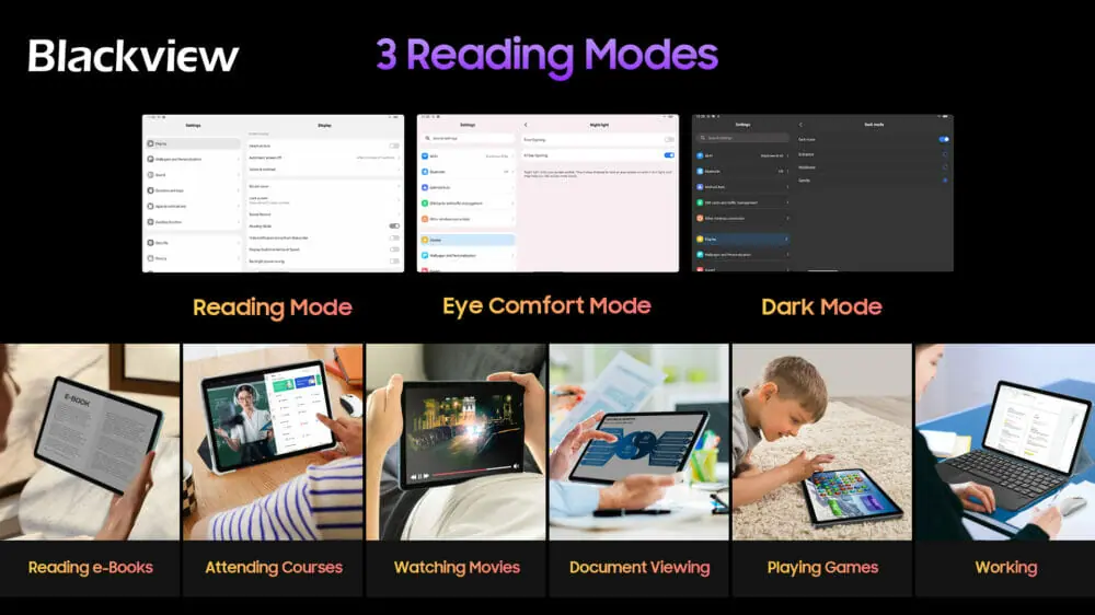 さらに、「TÜV Rheinland低ブルーライト」の認定を受けたTab 16は、3 つの読書モードをサポート。新聞 (Kindle) と同様の "読書モード" で電子書籍やニュースを視聴し、"Eye Comfort モード" で目の健康を確保し、長時間の使用による目の疲れを防ぐ。"暗所モード" も備えており、目の健康を三重に守る設計がなされている。