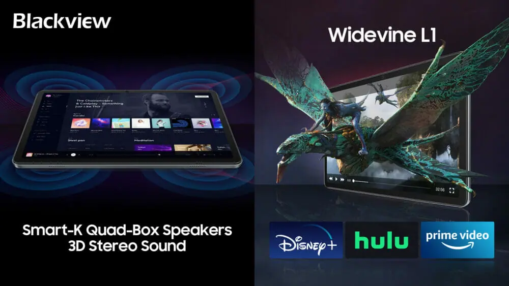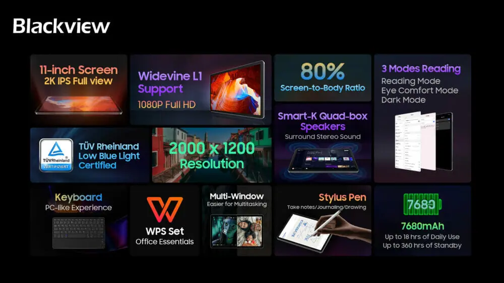 そしてこの度、最新モデルである『Blackview Tab 16』がデビューします。 10.5インチの前モデルよりも大きな11インチ画面を搭載。「Smart-K クアッドボックススピーカー」が内蔵されているなど、優れたオーディオおよびビデオエンターテイメント体験を提供するタブレットとなっている。
