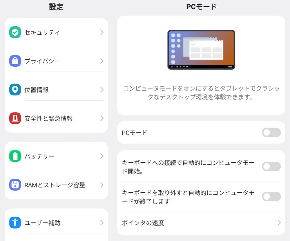 本製品はPCモードに対応しており、Windowsのようなインターフェース配置でタブレットを利用できる。