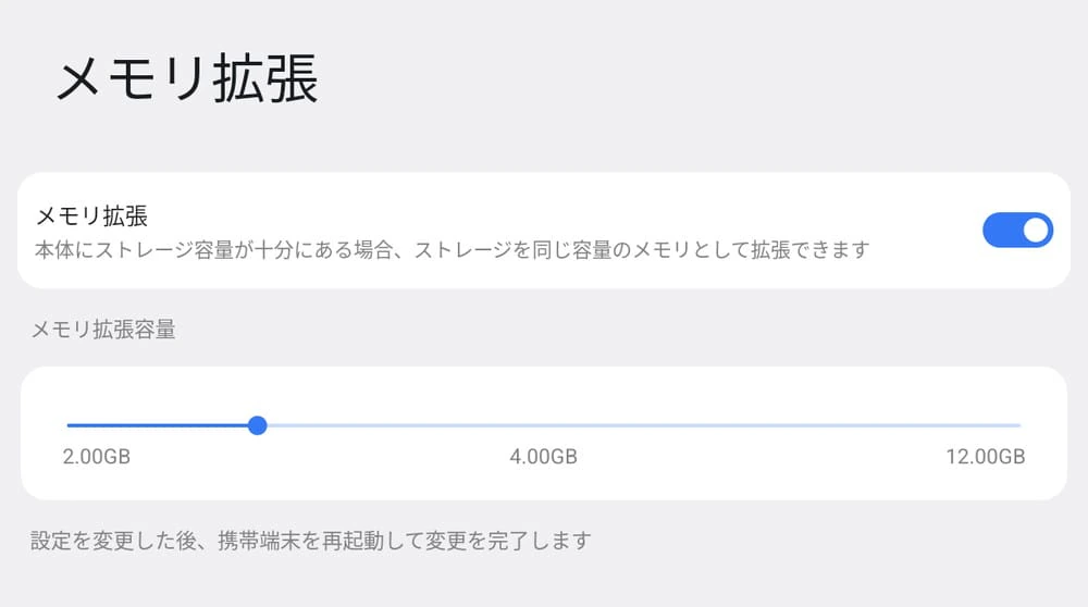 ▼ちなみに、設定アプリより最大12GBの仮想RAM拡張が可能だ。