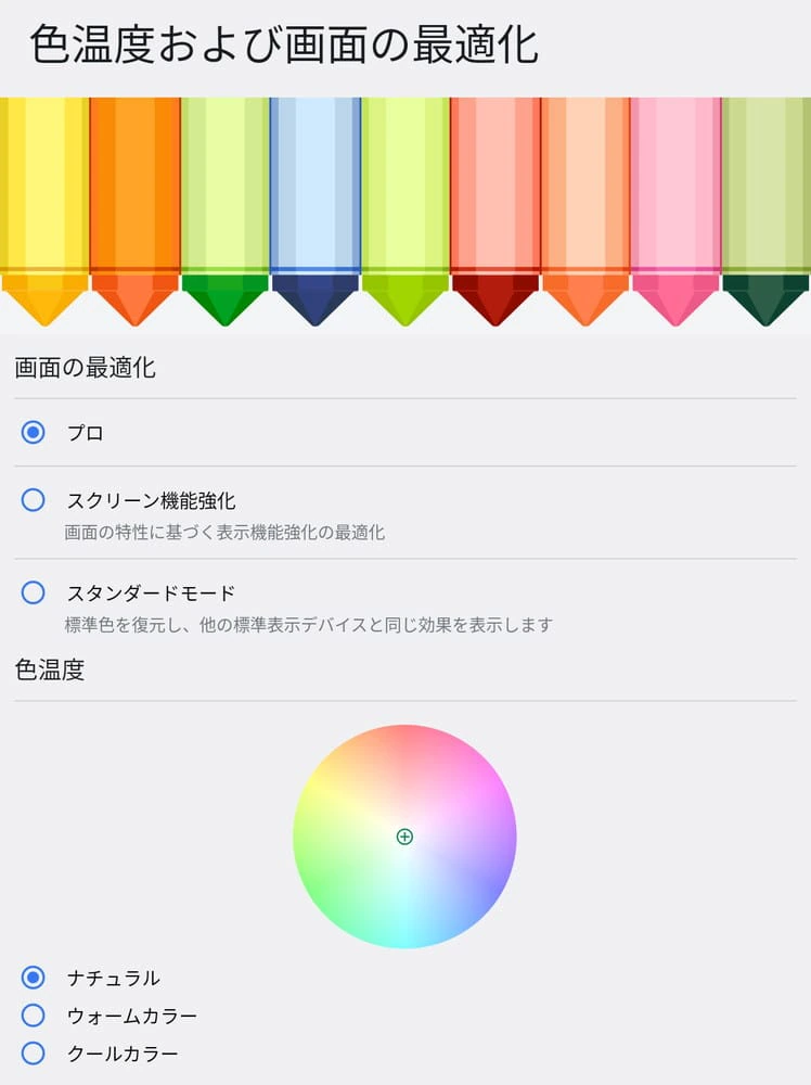 ▼設定アプリにて、色温度および画面の最適化を行うこともできる。